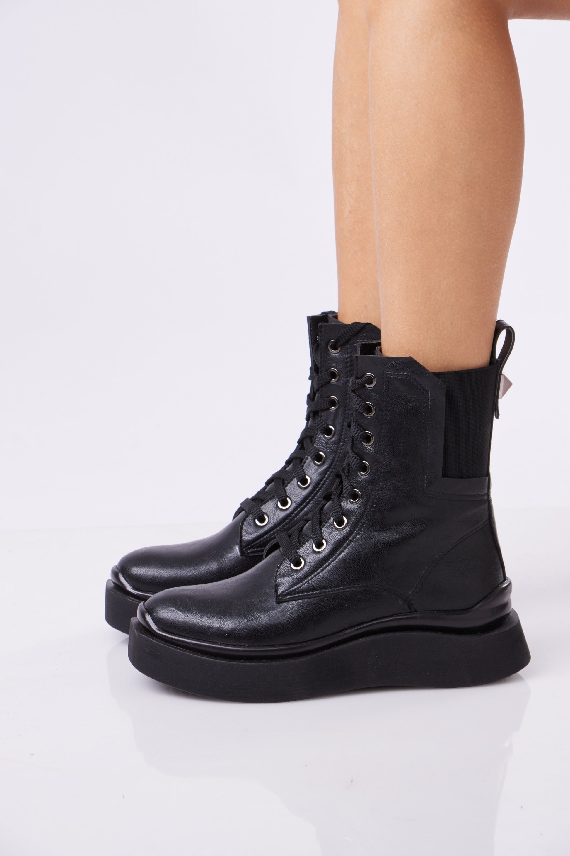 A bold platform combat boot designed for everyday comfort and effortless style. Crafted with a smooth leather-look finish, this boot features a lace-up front combined with a stretch panel that adapts naturally to the foot, offering a flexible and comfortable fit across sizes.